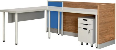 Ideal for maximizing office space this understated desk fits easily in most workspaces and enhances office decor with its sturdy titanium finished metal frame and the l shaped desk design offers ample space for computers and office equipment sturdy titanium finished metal frame and handsome fawn aged.